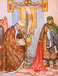 O Bispo, então, o acolheu, envolvendo-o com seu manto. Daquele momento em diante, cantando “Sou o arauto do Grande Rei, Jesus Cristo”, afastou-se de sua família e de seus amigos e entregou-se ao serviço dos leprosos, tratando de suas feridas, e à reconstrução das Capelas e Oratórios que cercavam a cidade.